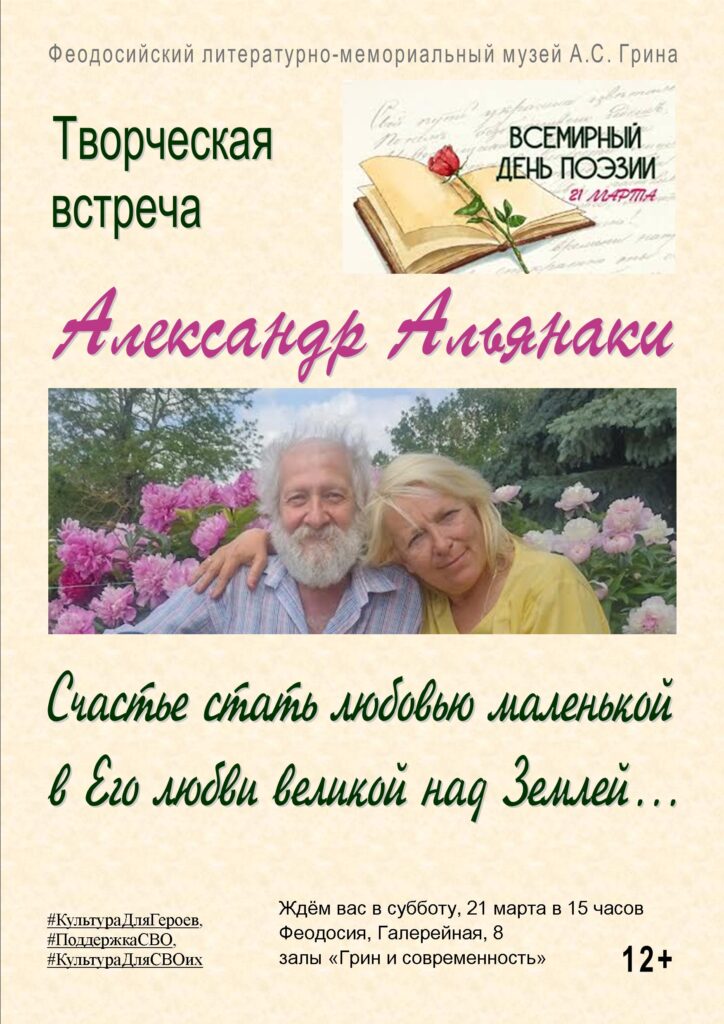 Приглашаем 21 марта в 15.00 в выставочные залы «Грин и современность» всех любителей поэзии на творческую встречу с Александром Альянаки- поэтом, сценаристом, актером. Александр пишет стихи о самых важных человеческих ценностях, философски осмысливая жизнь во всех её проявлениях. Как он сам говорит: Смысл жизни во всецелом раскрытии себя, своих способностей, чтобы отдать это Богу и людям. Истинная любовь — это не чувство, оно проходит, любовь — это состояние души, и оно вне времени. Оно ощущается, как свет внутри, и чем больше его отдаешь, тем больше и ярче он становится….Человеку всегда посылается то, что ему необходимо, — уверен Александр, поэтому надо быть благодарным за все. – Самое важное – найти свою «золотую середину», свою гармонию. И медленно в ней подниматься вверх, в течение жизни, сколько сможешь, не пытаясь слишком вырваться наверх и не слишком пасть вниз. Как ее найти? По тихой радости внутри. Когда идешь верным путем – тебе покойно и радостно.